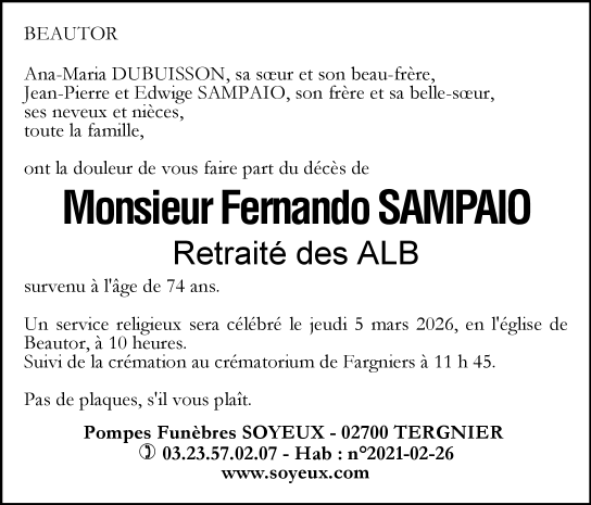 Décédé à La Fère (02800, France) le mercredi 25 février 2026 à l'âge de 74 ans